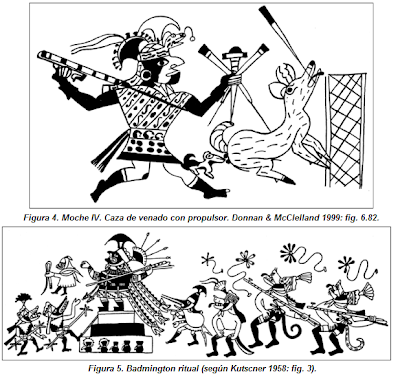 Esta especialización de armas entre los Mochicas ha sido asimismo notada por Verano (2001: 112-113) y Bischof (2005: 77). Con el fin de demostrar que la caza es una actividad ritual, Donnan (1978: 266) compara un combate entre humanos en donde los guerreros están armados de porras y llevan la chalchalcha (5) colgada de la cintura, a una caza de ante en donde los cazadores están armados de propulsores, y no llevan la chalchalcha (Ibid: fig. 265). Otra prueba según la cual el propulsor no es de uso guerrero, es su empleo en escenas de juegos rituales pintadas en varias vasijas comentadas por Kutscher (1958). En una escena de presentación de la vasija de sacrificio (Ibid. fig. 2; 1983, fig. 150), los personajes llevan a la vez un propulsor y lo que Donnan llama un “báculo de piezas cruzadas”, del cual un ejemplar ha sido hallado intacto en una tumba (Donnan y McCLleland 1978: fig. 115, 116). Ahora bien: estos báculos -de los cuales cuelga una soga terminada por un “pétalo o volante”- se encuentran entre las manos de personajes a punto de lanzarlos mediante un propulsor (Kutscher 1958, fig. 1). En una botella asa de estribo Moche V (Ibid.: fig. 113), los dos personajes de la izquierda llevan báculos de este tipo, mientras que los demás personajes levantan propulsores. En otra vasija (Fig. 5, Kutscher 1958, fig. 3), algunos personajes antropomorfos llevan a la mano este báculo de piezas cruzadas, mientras que otros se preparan a lanzar un venablo sin punta, y que alrededor de ellos, vuelan “pétalos o volantes” en suspensión, atados a la punta de una soga en cuyo extremo se encuentra una clavija. Según Kutscher (1958) y Hocquenghem (1979), estos báculos de piezas cruzadas serían utilizados en un juego ritual al que llaman badminton, durante el cual “pétalos de flores” (Bourget 2006) o “volantes” (Kutscher 1958) serían lanzados, a veces emparejados a la escena de la presentación. No obstante, los celebrantes no son guerreros, pues ninguno lleva la chalchalcha característica del atuendo de los guerreros mochicas.