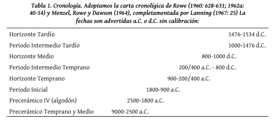 Para una mayor claridad, presentamos la evidencia arqueológica bajo la forma de la Tabla 4. Muelle (1957), Daggett (1984: 182-186 y fig.: 5.23-5.25) y Brennan (1978) proponen una descripción muy detallada, la cual permite evidenciar que las puntas encontradas en los valles de los ríos Moche, Nepeña, Casma o en Chavín (Lavallée 1969-1970), eran muy similares. Si bien algunos autores las fechan del Horizonte Temprano, abogamos (Chamussy 2009), que, por su asociación cronológica con el encuentro entre las poblaciones del Horizonte Temprano con aquellas del inicio del periodo Intermedio Temprano, se las puede considerar como elemento diagnóstico de esta fase.