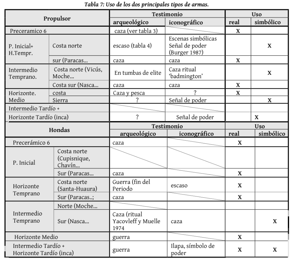 Dependiendo de su eventual estatuto guerrero, permitirá deducir -hasta cierto punto- el papel de las armas (percatándose de no caer en razonamientos circulares). En el caso de el área centro-andina, hemos defendido la tesis -a través de toda una serie de argumentos- según la cual la guerra era desconocida hasta la etapa más tardía del Horizonte Temprano (Chamussy 2009). En este caso, se podría deducir que las armas halladas antes de este momento tenían un destino cinegenético más que guerrero.