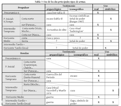 Lo cierto es que casi nunca se ha encontrado punta de venablo o de azagaya alguna en los esqueletos de los numerosos entierros, indistintamente del periodo, mientras que las huellas de traumatismos atribuidos a armas de choque son numerosas. Conocemos dos excepciones: una punta de flecha dentro del músculo del brazo de un varón de Paracas Necrópolis (Engel 1966, fig. 69) y otra incrustada dentro de una vértebra de un hombre en Huancalevica fechada del final de Nasca (Ravines 1967). Podemos también mencionar las puntas incrustadas en los huesos de entierros en Pacatnamú correspondiente a una probable matanza (Donnan y Cook 1986 vol. 1).