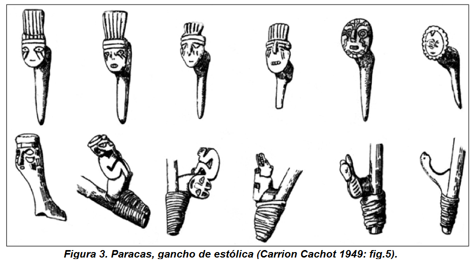 En la costa sur en cambio, en este mismo periodo, se encuentran numerosos propulsores en las tumbas de Paracas Cavernas (Tello y Xesspe 1979: 179 y fig.40.2; 233 fig. 68.5). En el Cerro Uhle (Ica), varios ejemplares completos de huesos de ballena con un gancho en “sperm whale tooth”, grabados en forma de rostros humanos y parecidos a aquellos encontrados en Paracas, fueron también hallados en tumbas (Morris y Von Hagen 1993: fig. 37). Carrión Cachot (1949: fig. 5) ilustra cierta cantidad de ganchos de estólicas tallados en hueso, encontrados en las tumbas de Paracas (Fig. 3) o de estólicas enteras bordadas en mantos funerarios. Se acota asimismo la presencia de algunas representaciones de cazadores armados de propulsores en petroglifos fechados de este periodo, en particular en Chichictara, en el valle del río Palpa (Llanos Jacinto 2009: 97 y fig.11.4).