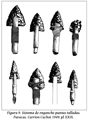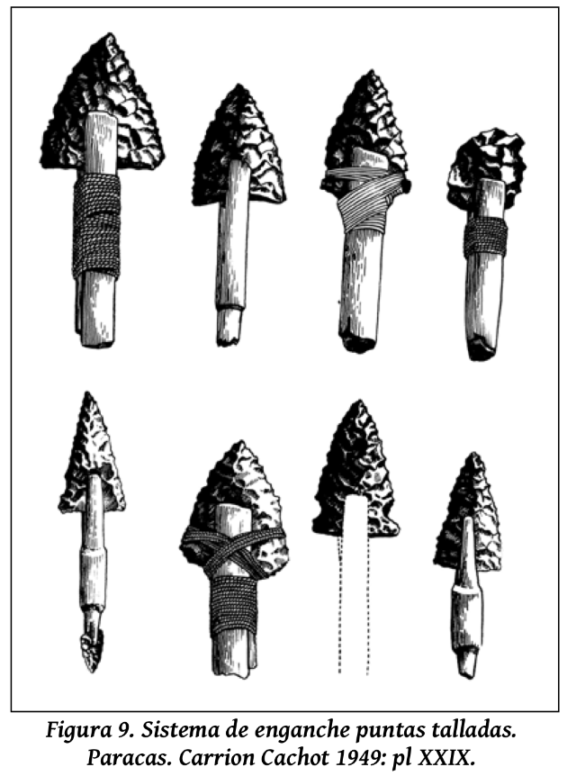 En el uso de los propulsores, vimos que se encuentran numerosas puntas de obsidiana en las tumbas de Paracas Cavernas fechadas del final del Horizonte Temprano, probablemente utilizadas como puntas de azagaya o de venablo. Algunas presentan huellas de sogas de algodón enrolladas, posiblemente destinadas a halar el venablo hacia sí cuando éste no había alcanzado su objetivo, o para sacar al pez, en el caso de ser usado como arpón (Uhle 1909).