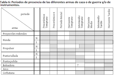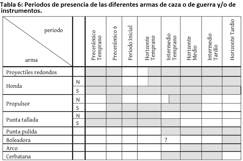 Velarde (1980: 68) estima que algunas puntas muy pequeñas de piedra, que no habrían podido ser lanzadas sino únicamente mediante flechas muy livianas, dan cuenta de su presencia en el periodo Inicial y Horizonte Temprano. Klink y Aldenderfer (2005: 52-54) piensan que la forma más pequeña de puntas de obsidiana de su tipo 5d (largo comprendido entre 16 y 26 mm), está probablemente vinculada a la adopción de la tecnología del arco y la flecha de su periodo Arcaico Terminal (4400-3600 antes del presente) en la sierra, y se irá acentuando durante el periodo Formativo. Llegan hasta proponer que la presencia del arco podría estar ligada a guerras territoriales, tal como lo sugieren las pinturas rupestres de Río Huenque. Pero fuera de estas hipótesis, hay que subrayar que no se tiene prueba material alguna al respecto, pues los restos de los arcos como tales nunca han sido encontrados y, tal como lo subrayan los autores (Ibid.: 52), estas puntas podían muy bien servir para venablos o azagayas. En la cita ya mencionada de Bartolomé de las Casas (1550), quien describe un periodo Antiguo que Donnan (1978: 87) estima ser el periodo Intermedio Temprano, se dice: “no tenían flechas ni arcos […] [en las sierras]”.