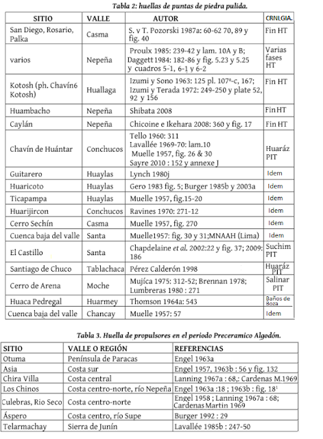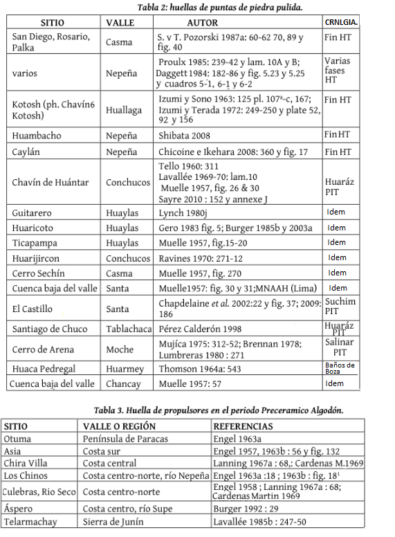 En la costa del área centro-andina, su uso parece ser desconocido en el Precerámico antes de la fase 6 de Lanning (2500-1800 a.C.)(3). Esta ausencia en la costa, cuando existía ya desde hacía mucho tiempo antes en la selva amazónica (Métraux 1963: 229), está sin duda ligada al hecho de que la subsistencia aquí era esencialmente marítima y hortícola. La caza terrestre debía desempeñar un papel muy débil, en tanto que la caza de mamíferos marinos en las playas se realizaba con mazos y no con hondas. Los propulsores más antiguos datan del Precerámico fase 6 de Lanning y fueron hallados en los sitios mencionados en la tabla 2.