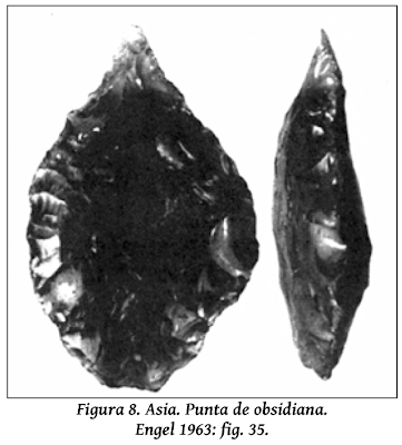 En la costa central, la tradición de las bellas puntas talladas de obsidiana o de cuarcita (Fig. 8) ha perdurado por mucho más tiempo, por ejemplo en los sitios del Precerámico Final de Chira Villa (Lanning 1967: 78), Chilca (Engel 1988), Asia (Engel 1963b) y Río Seco (Wendt 1964, fig. 19, 20). Podría tratarse de armazones de venablos lanzados mediante propulsores encontrados en el mismo sitio, más aún a sabiendas de que, en Asia, según el autor, había también restos de una aljaba de caña y algodón (Engel 1963b: 56 y fig.133-135). En este caso, se trataría probablemente de caza de animales pequeños o de aves.