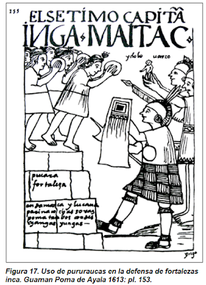 Las descripciones escritas por los cronistas se refieren básicamente al Horizonte Tardío, pero ciertos autores sugieren que se puede llegar hasta más atrás en el pasado. Un fragmento de Bartolomé de las Casas (1550), describe un periodo antiguo que Donnan (1978: 87) considera ser el periodo Intermedio Temprano (400/200 a.C.-700 d.C.): “Las armas suyas principales eran hondas; no tenian flechas ni arcos, mas de unas como rodelas para se defender de las piedras. Esto era en la gentes de las sierras; pero en los llanos que llamaban yungas, peleaban algunos con flechas sin yerba: en otras partes con dardos hechos de unas cañahejas, y en lugar de caxquillos, puntas de palmas o de güeso, y tirabanlos con amiento, los cuales eran en tirallos muy diestros y certeros”. Guamán Poma (1613: 64) enumera las armas de los guerreros asociados a la tormentosa época del periodo Intermedio Tardío, llamada en quechua “auqua runa”, que marcó la desintegración de los estados del Horizonte Medio: “[…] y peleanban con armas que ellos les llamaban chasca chuqui, zuchac chuqui sacmana [lanzas], chambi [mazas], uaraca [honda], conca cuchona, ayri uallcanca [hacha], pura pura [pectoral de metal], uma chuco [casco], uaylla quepa [trompeta de caracol], antara [zampoña]. Y con estas armas se uencían y auía muy mucha muerte y derramamiento de sangre hasta cautiuarze.”
